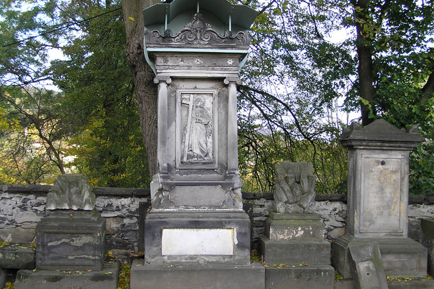 Ve třetí čtvrtině 19. století byla kapacita celého hřbitova téměř obsazena, proto obec založila severovýchodně od kostela hřbitov nový, starý byl oficiálně uzavřen a v roce 1910 zplanýrován. V současné době je zde zachováno 51 náhrobků z rozmezí let 1767–1910. Typologicky jde o figurální a architektonicky koncipovaná díla. Jejich materiálem je převážně pískovec, v menší míře doplněný mramorem, trachytem, břidlicí a kovovými nebo porcelánovými prvky. Některé z náhrobků pochází z dílen významných kameníků a sochařů – například Josefa a Emanuela Maxe, Leopolda Zimmera, Franze Neusara nebo Josefa Seicheho.