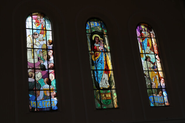 Působivým prvkem v interiéru jsou vitráže. Kromě šesti oken z doby výstavby zde nalezneme i několik vitráží vyrobených po druhé světové válce z popudu prvního poválečného kněze, pátera Konráda Gebharda. Zachycují legendu o zdejší mariánské soše.