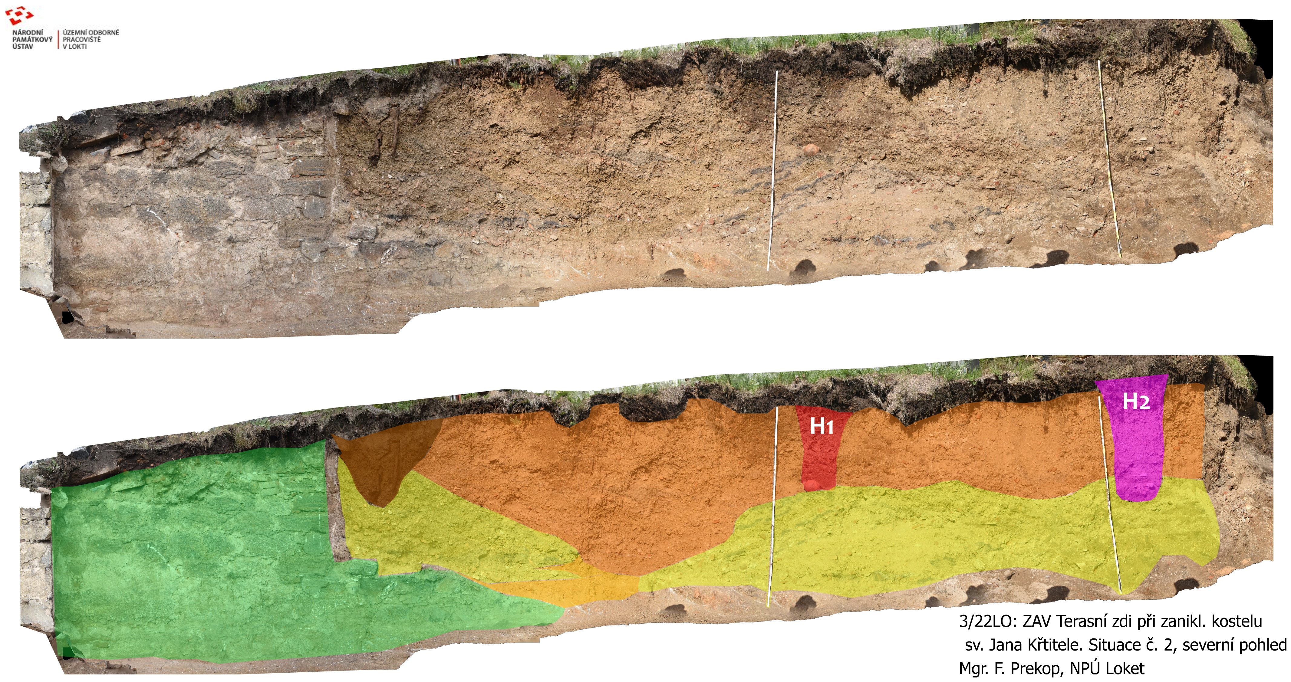 V průběhu roku 2022 jsme archeologicky sledovali realizaci obnovy terasních zdí v místech zaniklého kostela sv. Jana Křtitele v Lokti. Cílem stavby bylo přezdění částečně i zcela zřícených úseků historického zdiva, mezi kterým jsou také pozůstatky obvodových zdí zmíněného kostela. Konkrétně se jedná o jeho nejmladší fázi z let 1857–1973. Dále stavba odhalila několik přilehlých hrobů. Díky vřelé spolupráci se zadavatelem stavby, městem Loket, a zhotovitelem stavby, firmou BOLID – M, s.r.o., se podařilo zachovat a vizuálně prezentovat zbytky zdiva kostela mezi nově budovanými zdmi i respektovat identifikované hroby v původních místech uložení. Revitalizace prostoru poukázala na relativně opomíjené místo s pestrou historií, která je komplikovanější, než se může na první pohled zdát.