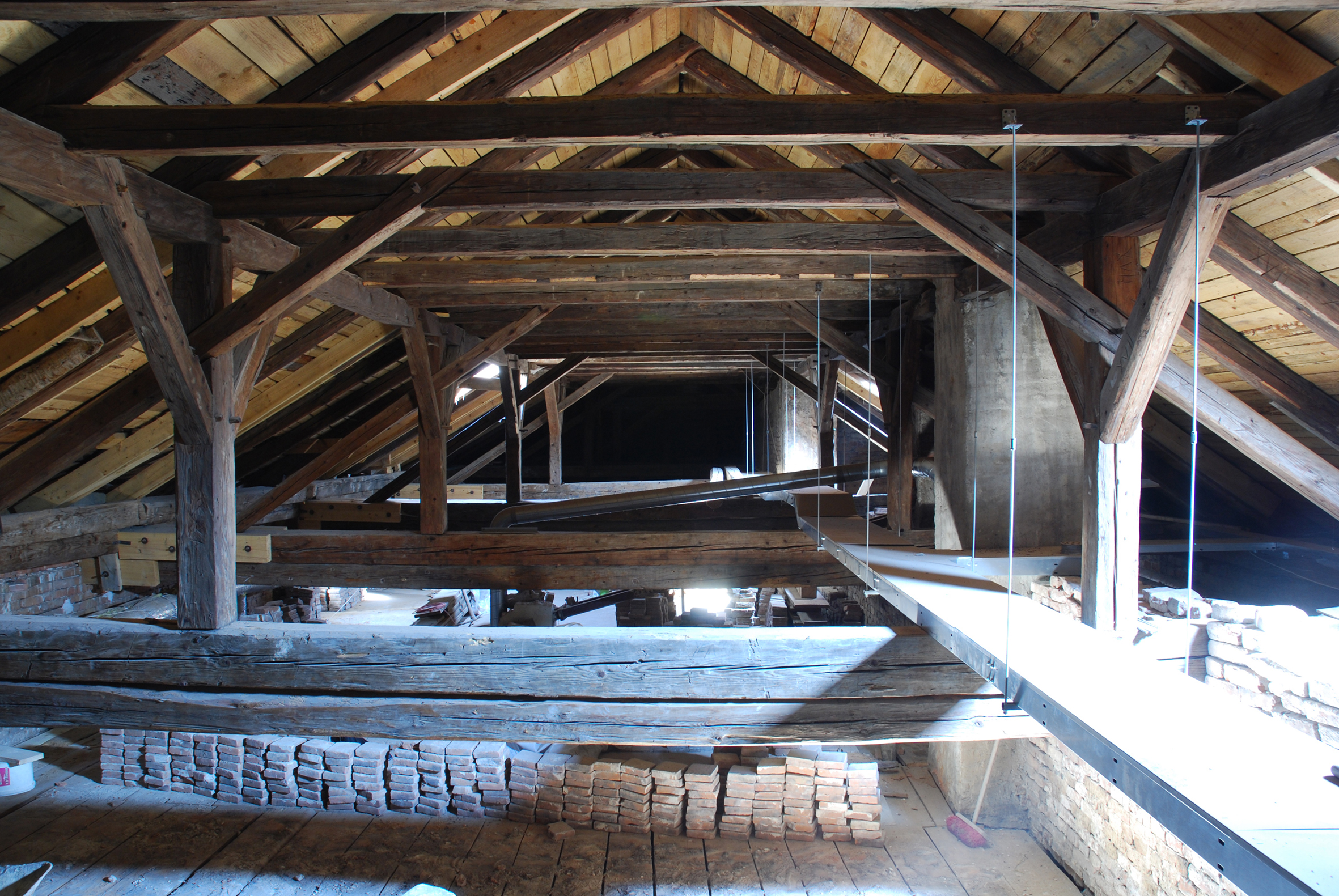 Jako výchozí podklad pro návrh konstrukční sanace krovů posloužil stavebně-technický průzkum, vyhotovený Ing. Michalem Kloibrem, Ph.D. Jeho cílem bylo přesně zdokumentovat podobu a rozsah poškození jednotlivých dřevěných prvků, jinými slovy určit rozsah zachování autentického materiálu. Pro identifikaci poškození a poruch byly využity vizuální a speciální přístrojové nedestruktivní a semidestruktivní diagnostické metody (blíže k metodice takových průzkumů a k jejich výsledkům vizte Michal Kloiber, Miloš Drdácký, Diagnostika dřevěných konstrukcí. Praha 2015). Na základě výsledků uvedeného průzkumu byl kanceláří ateliér-r, s. r. o. vypracován podrobný, staticky podložený projekt konstrukční sanace krovů. Jeho základním východiskem bylo zachovat konstrukční systém krovů, zachovat co nejvíce původního materiálu a zároveň do jisté míry zohlednit v současné době pomalu se prosazující přístupy obnovy, které upřednostňují tradiční řemeslnou práci. I když projekt počítal s výměnou celých poškozených prvků a ve zcela ojedinělých případech například i s posilováním některých poddimenzovaných částí konstrukcí příložkami, v převážené většině poškozených partií dřevěných prvků bylo navrženo protézování, přičemž se upřednostňovaly zejména celodřevěné plátové spoje. K ověření správnosti navržení těchto speciálních spojů projektanti využili možnosti přímé spolupráce s autory metodiky Celodřevěné plátové spoje pro opravy historických konstrukcí (Jiří Kunecký a kolektiv, Celodřevěné plátové spoje pro opravy historických konstrukcí. Praha 2015).