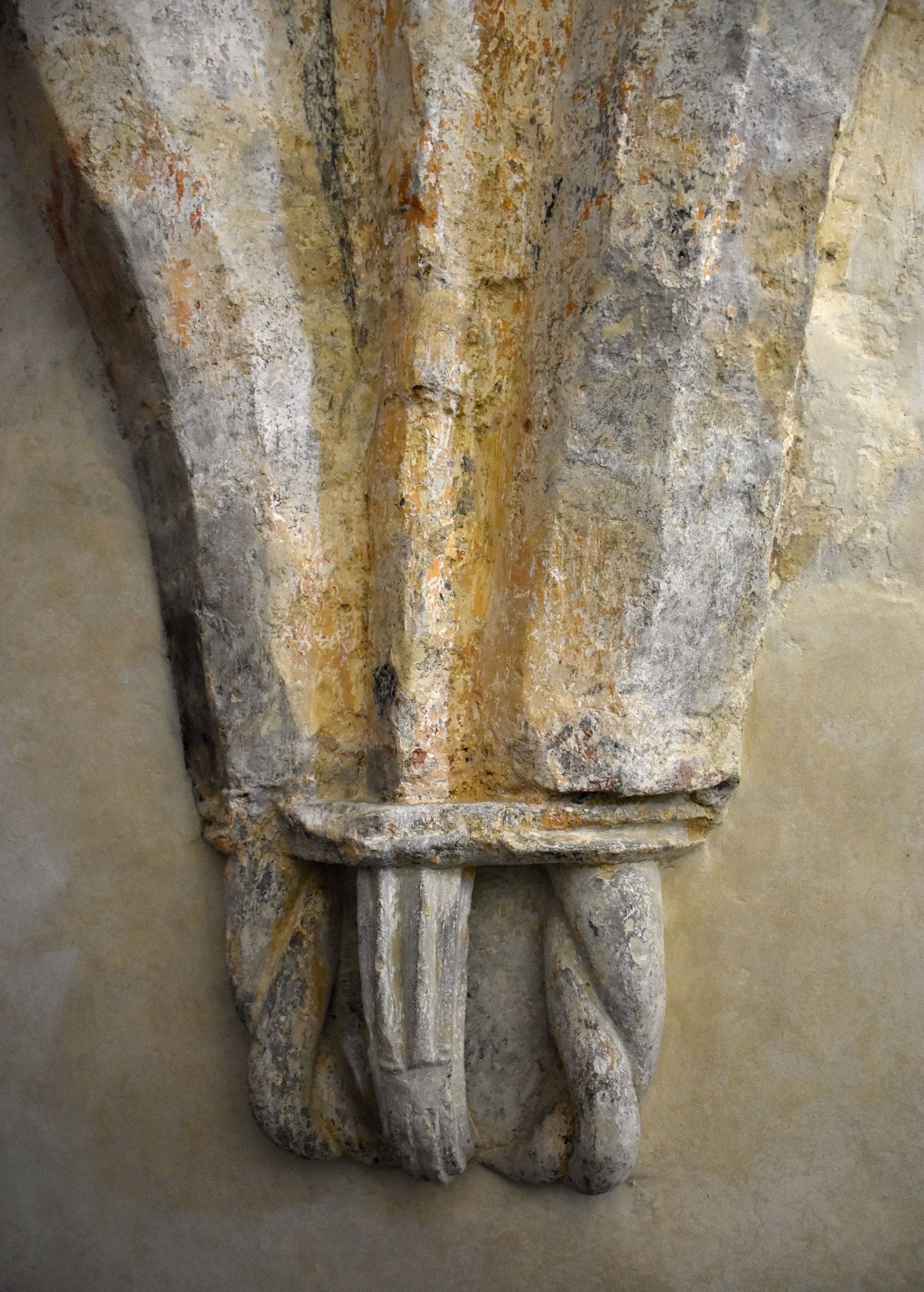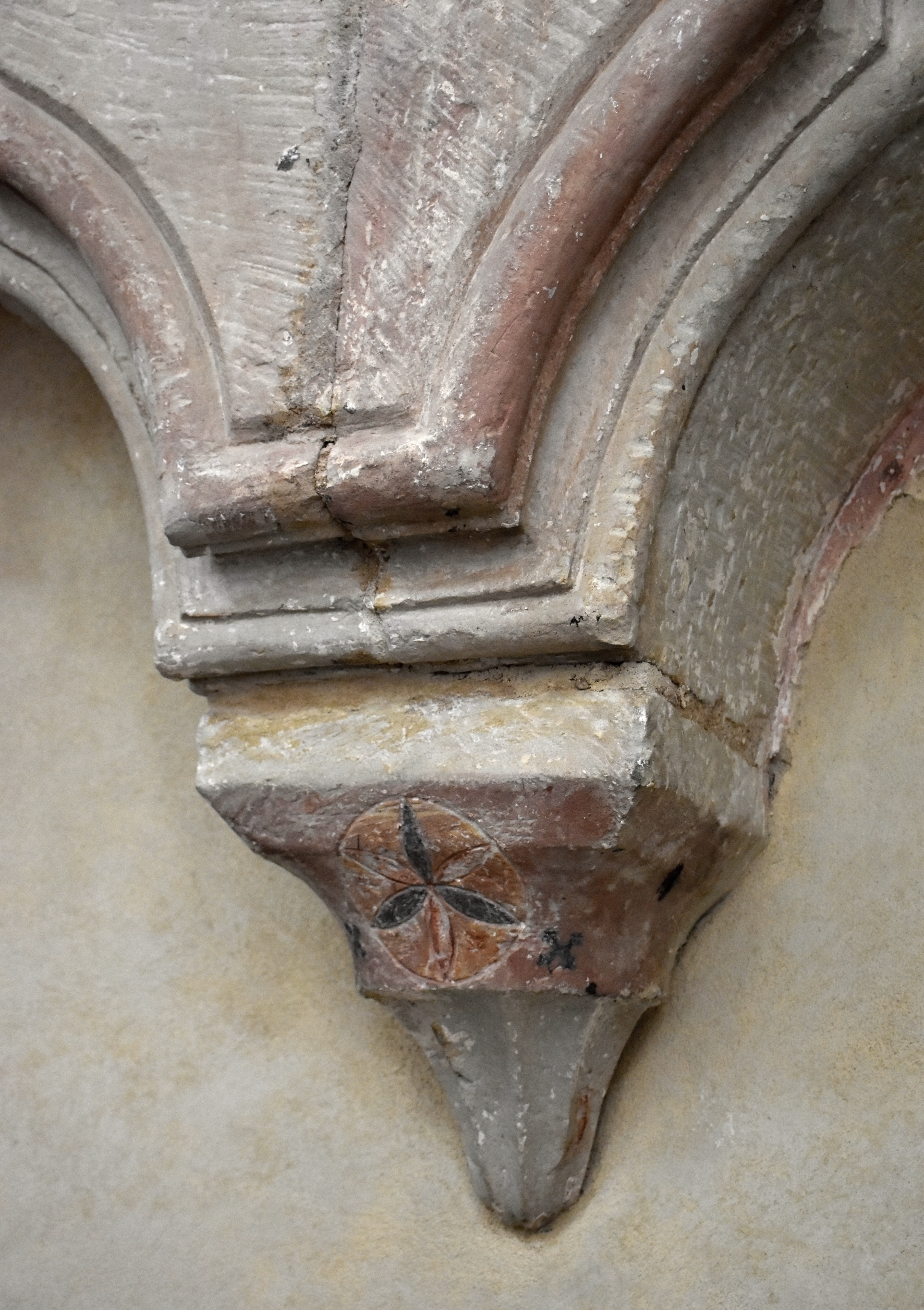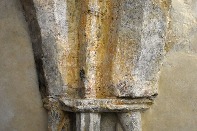 Sedile s trojicí jetelových záklenků podepřených dvěma konzolami bylo zhotoveno z bělavého jemnozrnného pískovce, na něm i v jeho okolí se dochovaly zbytky původního barevného pojednání, v němž se střídají červená, žlutá a černá. Na povrchu portálu se zachovala středověká barevná úprava v kombinaci červené a žluté.