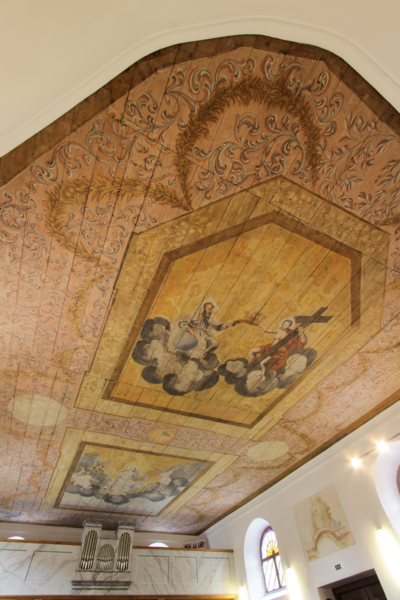 Vyobrazeny jsou figurální motivy korunování P. Marie s motivem Boha Otce a bohatou vegetabilní výzdobou. Dílo vysoké umělecké kvality, vytvořené umělcem se zkušeností s monumentální nástěnnou malbou, prošlo kompletním restaurátorským zásahem s důrazem na konzervaci a očištění původní raně barokní malby. Restaurátorské práce provedli Romana Balcarová a Peter Stirber.