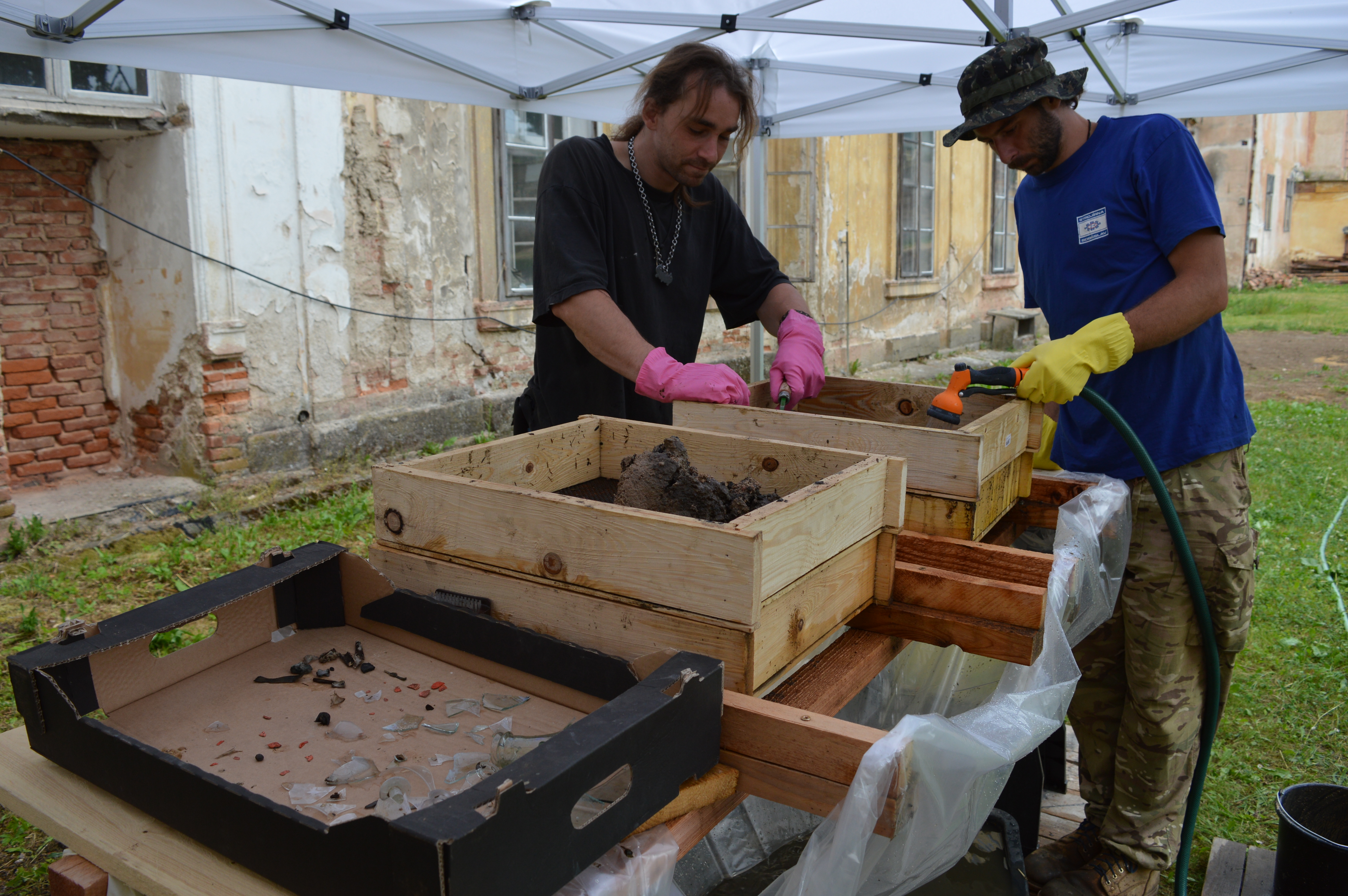 Sediment byl těžen po kbelících a proplachován proudem vody přes síta.
