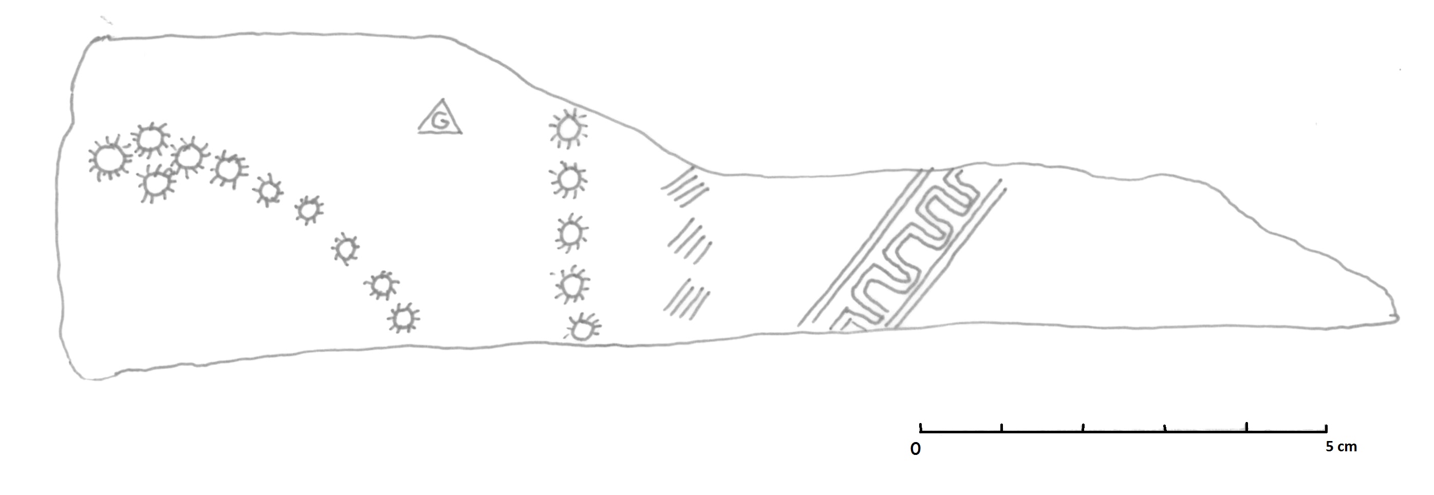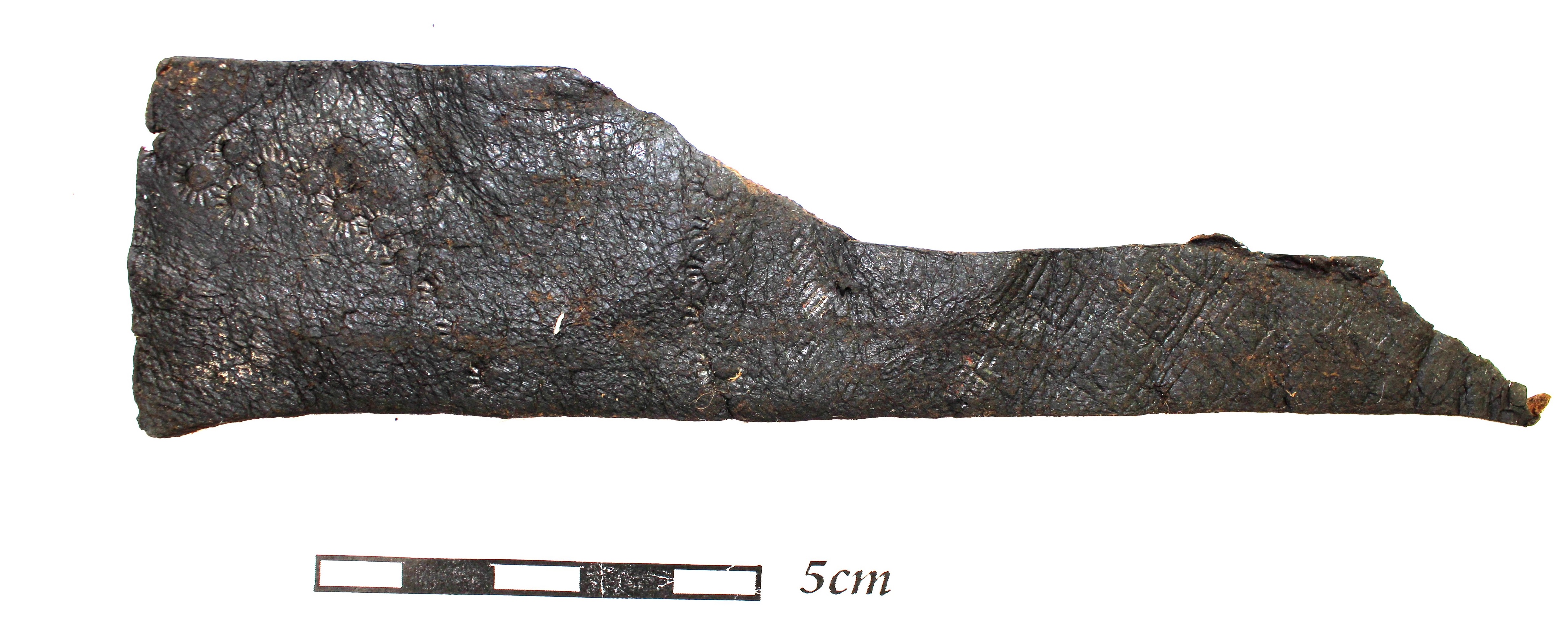 Ústřižek usně, který zřejmě sloužil pro zkoušku funkce slepotiskových raznic, pravděpodobně dekor na ozdobnou knižní vazbu. Foto a kresba: J. Figura.