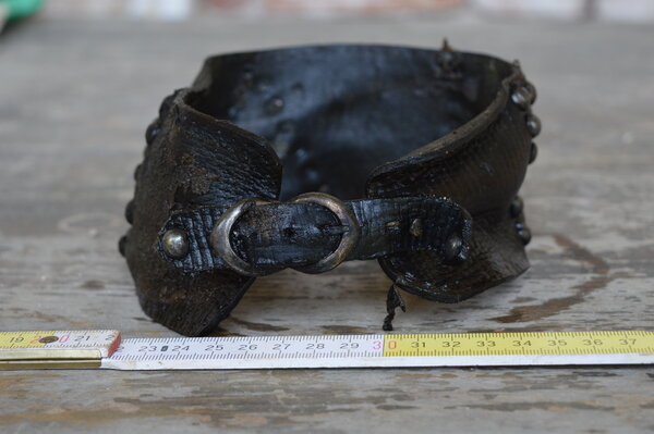 Zcela výjimečným artefaktem je psí obojek (připomeňme, že rozbor kostí odhalil pozůstatky nejméně tří psů). Obojek byl nalezen zapnutý na kovovou přezku. Je zhotoven z hovězinové usně, která nese stopy po válcování, jež dalo povrchu dekor, a ozdoben nápisem „PLAS“ z mosazných pukliček. Ty se používaly v dané době zejména pro výrobu čalounických hřebíčků, které se rovněž ve fondu nacházejí; další možností pro využití pukliček je u vazby knih.