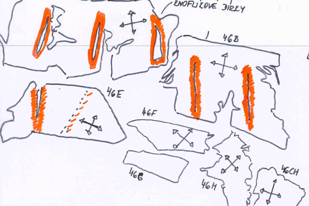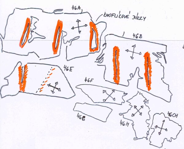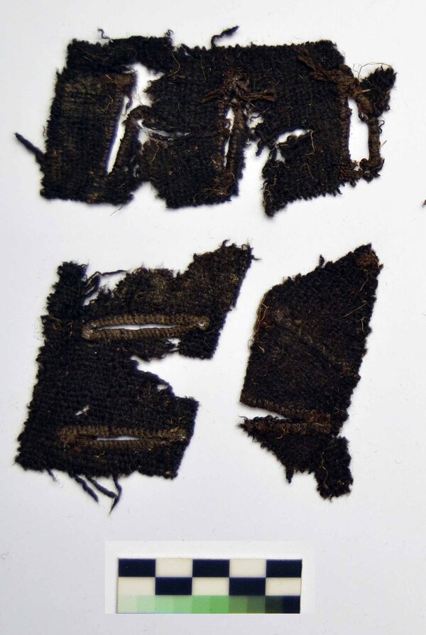 Ukázka dokumentace a vyhodnocení textilu: tři fragmenty T46 a, b, e. Vlna s plátnovou vazbou, dostava 9 na 8, jemně valchováno. Šipky naznačují směr osnovy a útku. T46a tři obšívané dírky, T46b dvě obšívané dírky, T46e obšívaná dírka a šev. Foto: archiv Západočeského muzea v Plzni, kresba: V. Pilná.