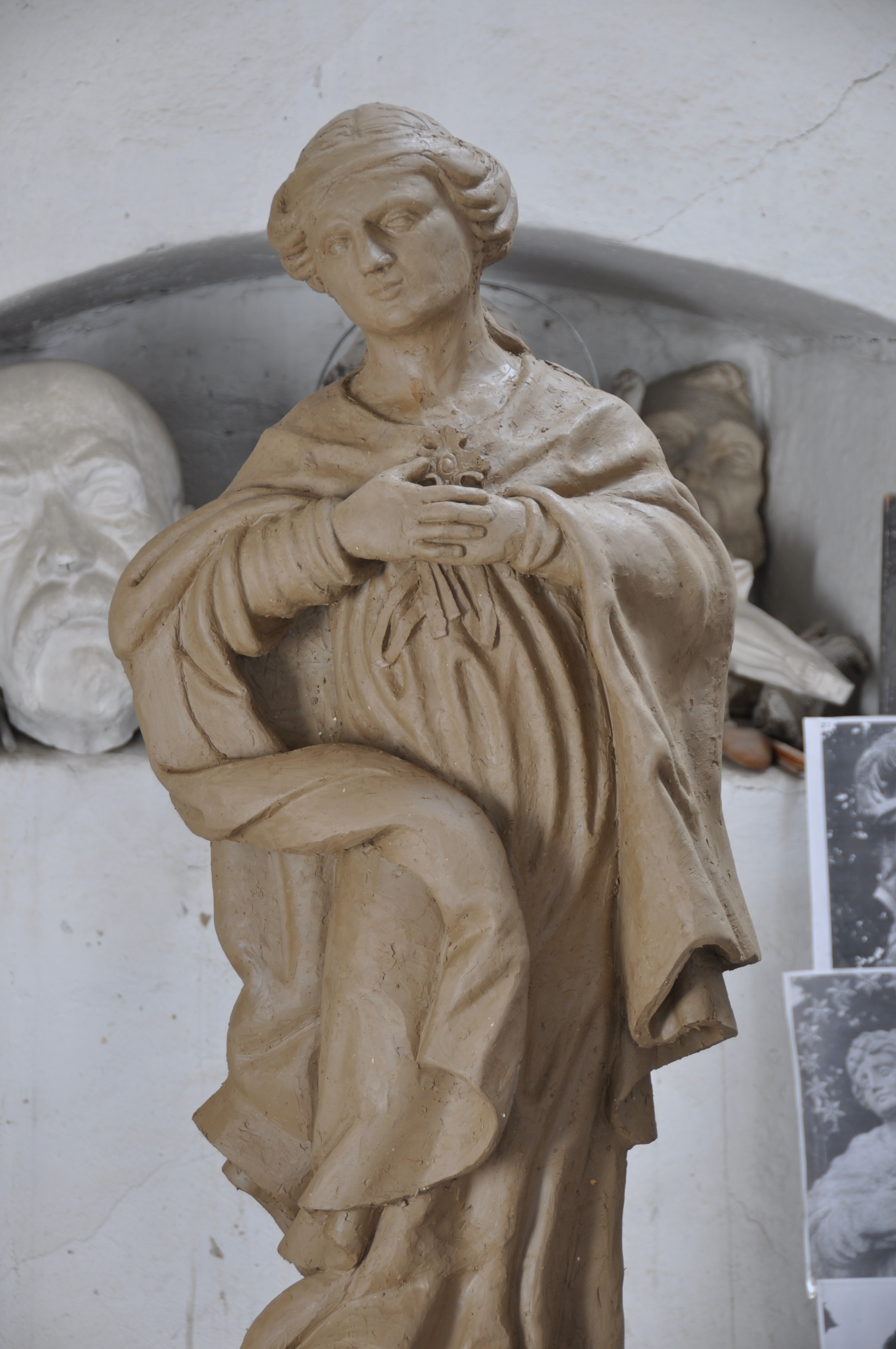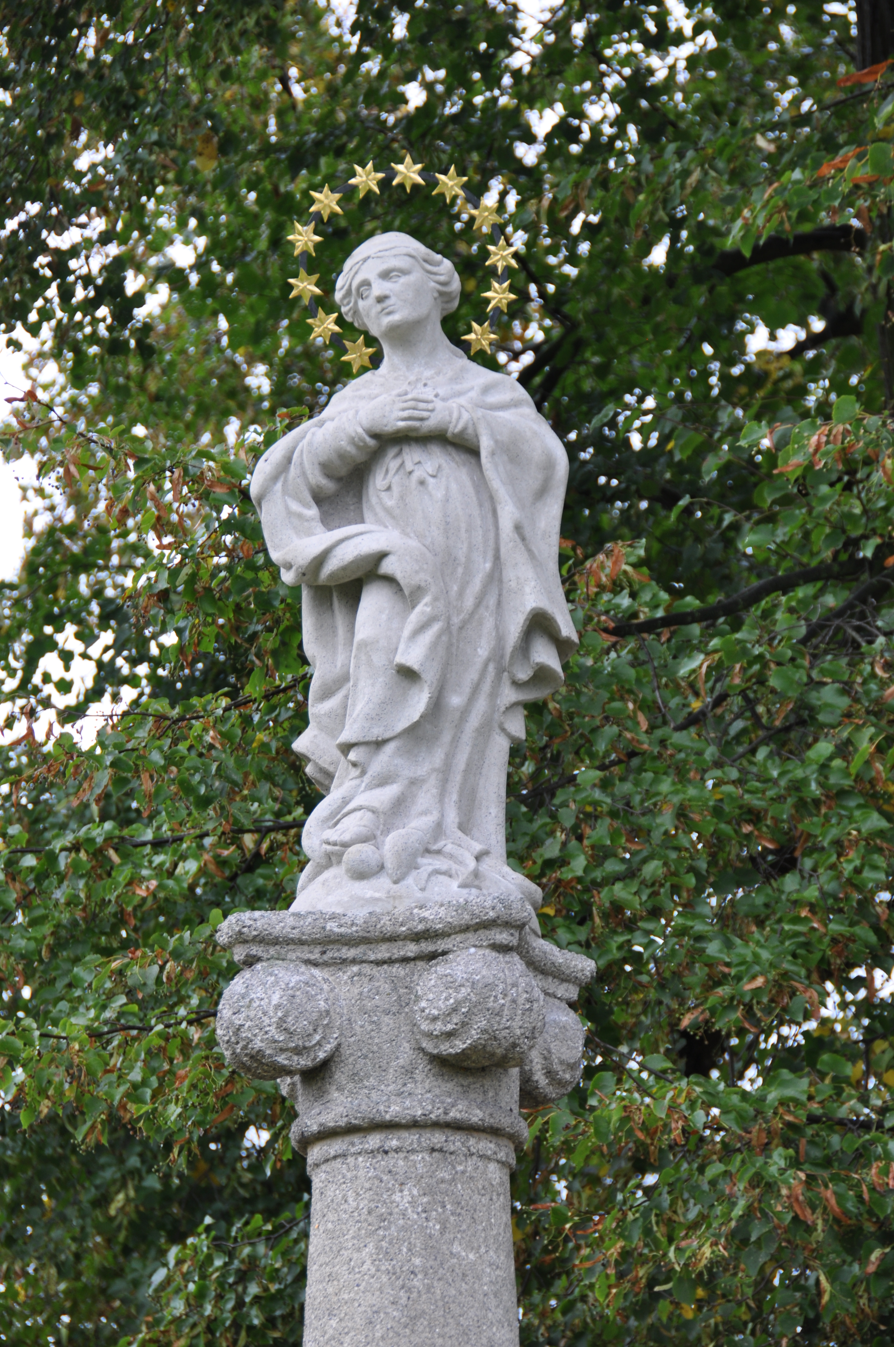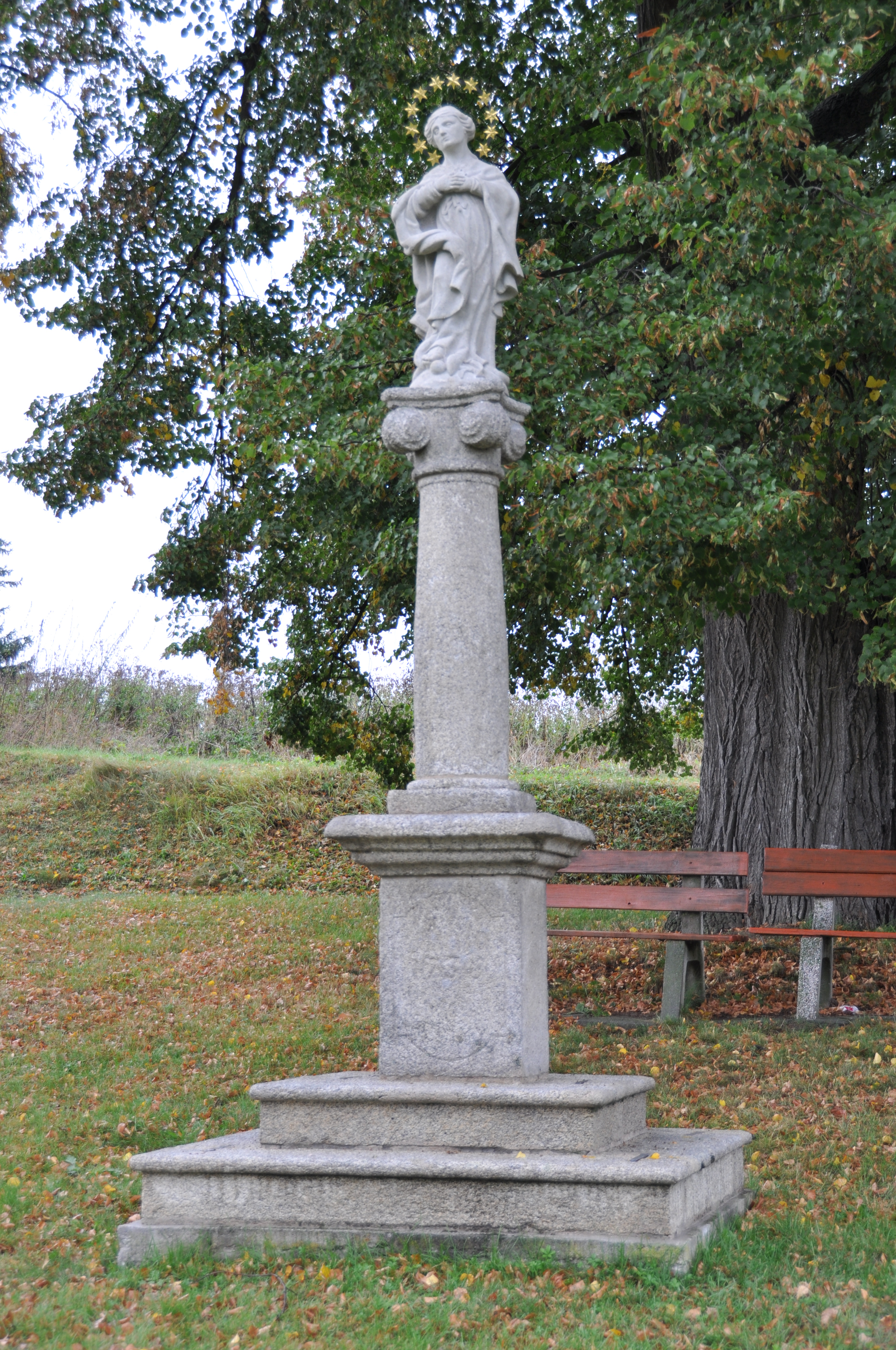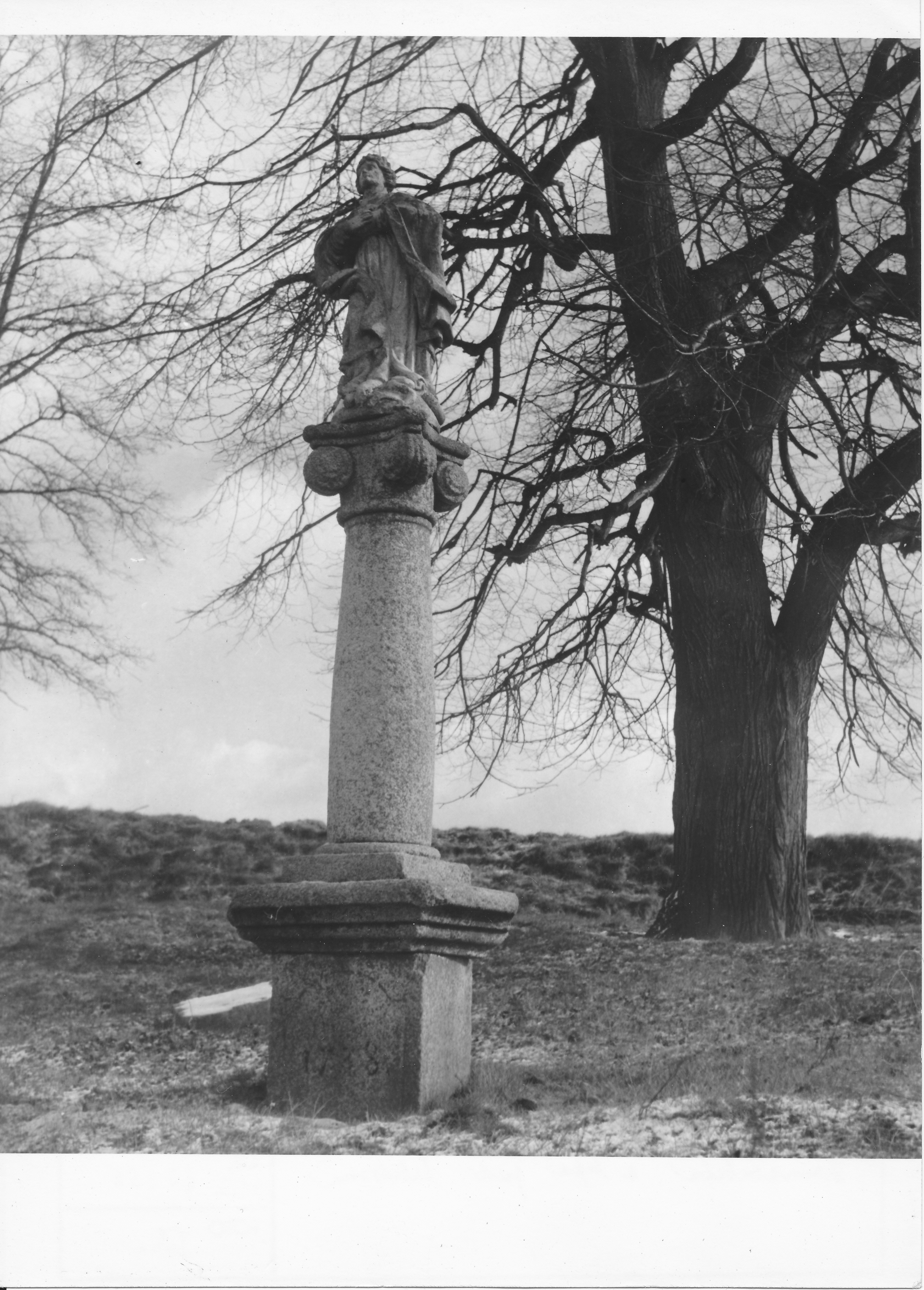 Odcizená socha Panny Marie spočívající na polokouli obtočené hadem byla osazena na sloupu s volutovou hlavicí, osazeném na hranolovém podstavci s předsazenou římsou a stupňovitým soklem. Podstavec se sloupem se dochoval na místě a vyžadoval jen běžné restaurátorské ošetření. V případě zhotovení kopie sochy Panny Marie pouze na základě dochované fotodokumentace se jednalo o obtížný restaurátorský úkol. Podklady ke zhotovení kopie byly hledány jak ve sbírkách generálního ředitelství NPÚ v Praze, územního odborného pracoviště NPÚ v Plzni, tak i v muzeích a dalších institucích. Nejpřínosnějšími se ukázaly být fotografie z předchozího restaurátorského zásahu ak. soch. Martina Širokého, který proběhl v roce 2000. Jeho restaurátorská zpráva obsahovala řadu snímků sochy z průběhu restaurování.