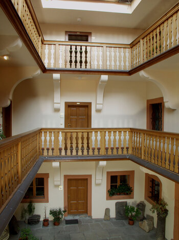 Zřejmě již přestavby uskutečněné do konce 17. století měly mimo jiné za následek zmenšení prostoru vstupní síně v přízemí předního domu. Je možné, že už tehdy se hlavní schodiště přesunulo od boku západního hlavního jádra dispozice na protější stranu síně, k boku jádra východního, tedy zhruba na dnešní místo. V každém případě však přední dům nejpozději v 2. polovině 17. století získal v podstatě dnešní objem. K lepší představě o něm je možné si ještě vybavit hypotetické zděné štíty sedlových střech.