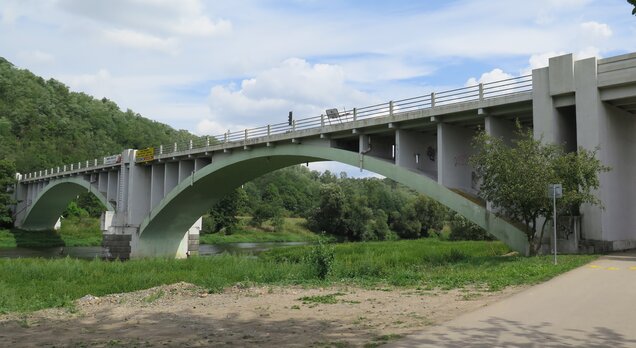 Železobetonový obloukový silniční most přes Berounku, vystavěný v roce 1929.