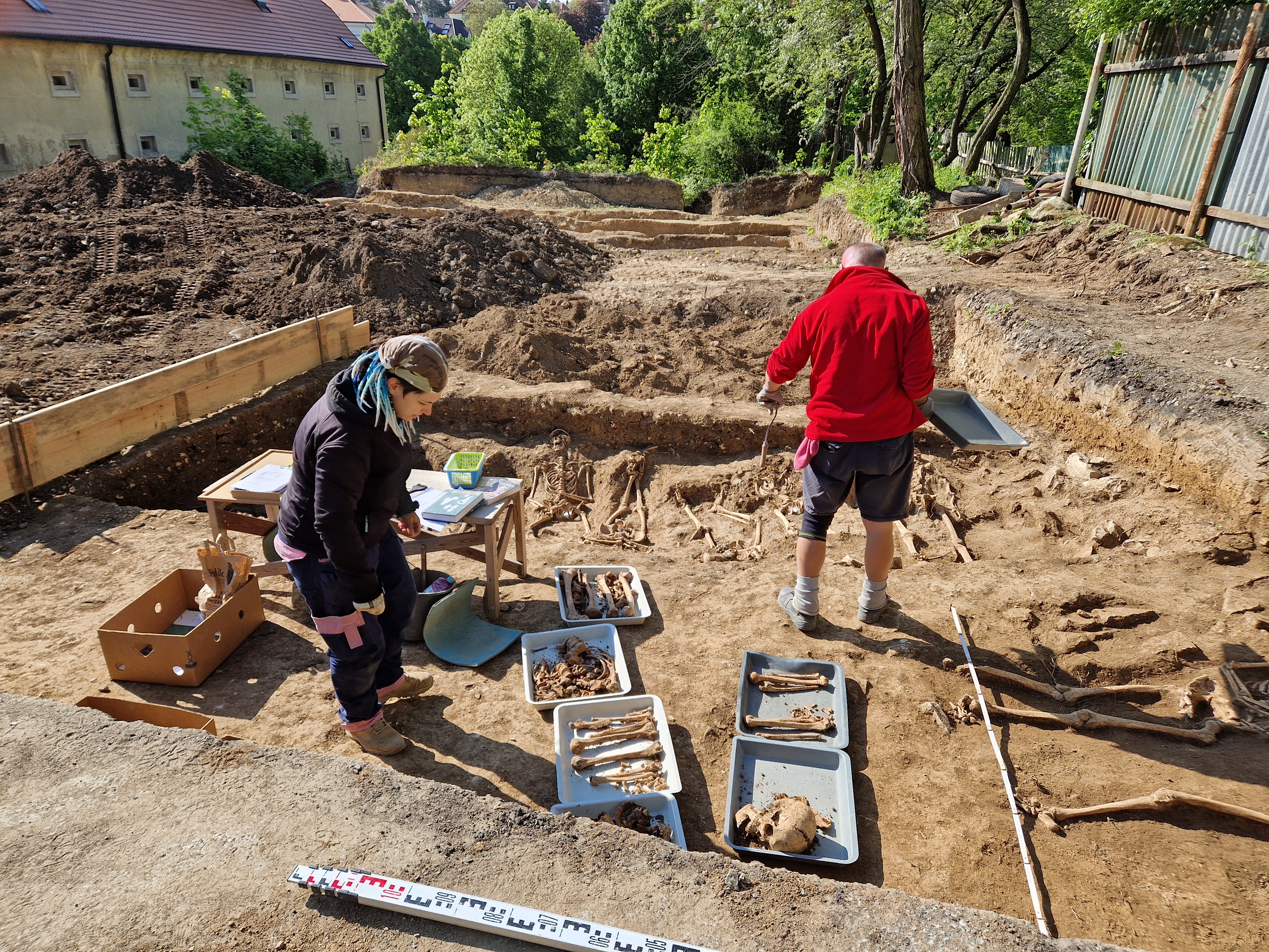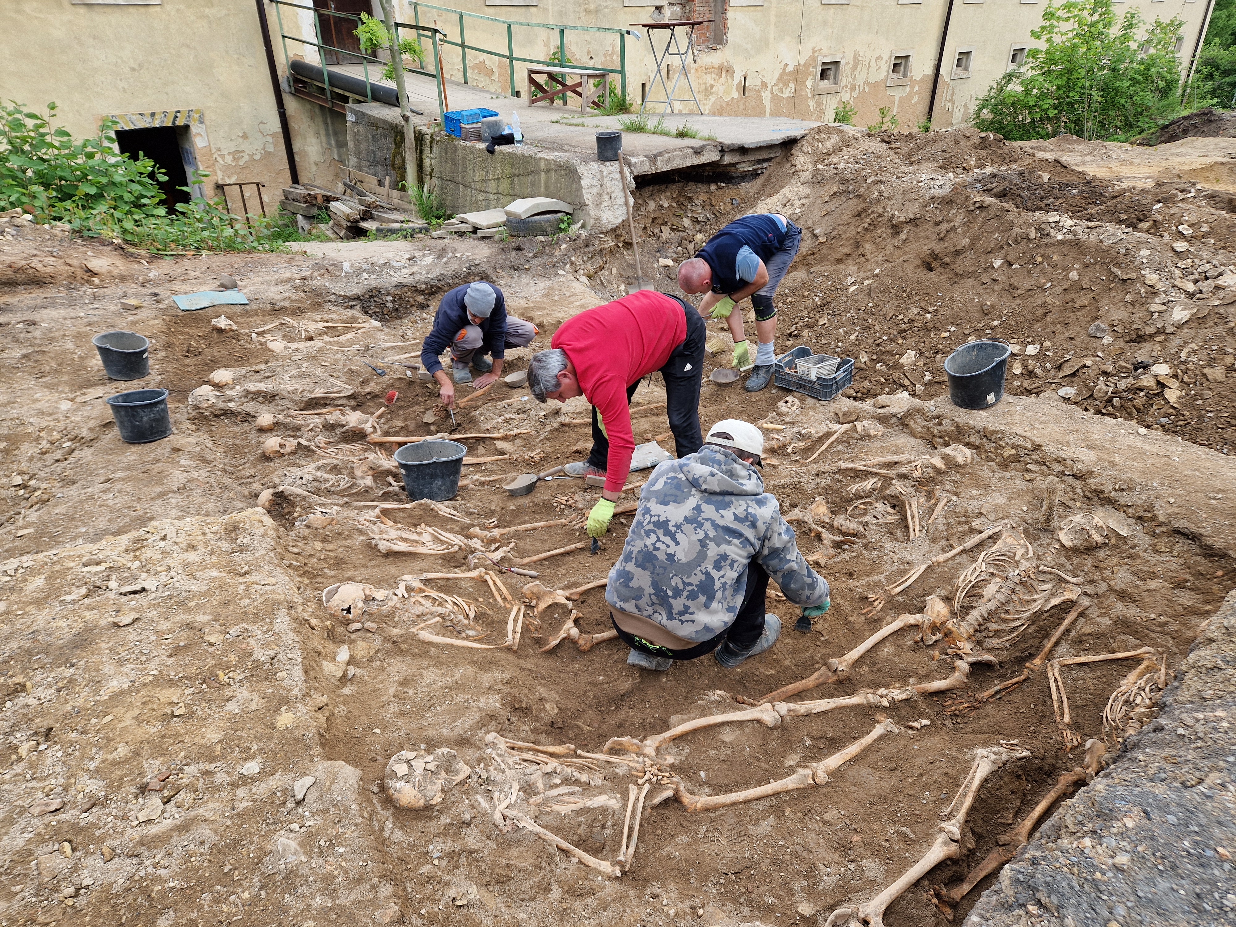 První etapa výzkumu proběhla od léta do podzimu 2024 v jižní části prostoru za sýpkou. Archeologové NPÚ ve spolupráci s antropology odkryli a vyzvedli 1055 kosterních ostatků z deseti liniových hrobů, počet v českém, ale i v evropském měřítku zcela nebývalý, včetně zbytků látek, knoflíků nebo přezek z uniforem, různé ráže projektilů a zbytků kartáčových střel. Během druhé etapy v severní části pozemku od dubna do července 2025 bylo objeveno dalších 234 jedinců, z nichž většina byla opět pohřbena v liniovém hrobě, avšak vedle toho byly odkryty čtyři společné hroby a několik samostatných, zřejmě starších pohřbů. Výsledkem obou etap tak je vyzvednutí kosterních pozůstatků celkem 1289 jedinců, z nichž pouze jedny patřily ženě.