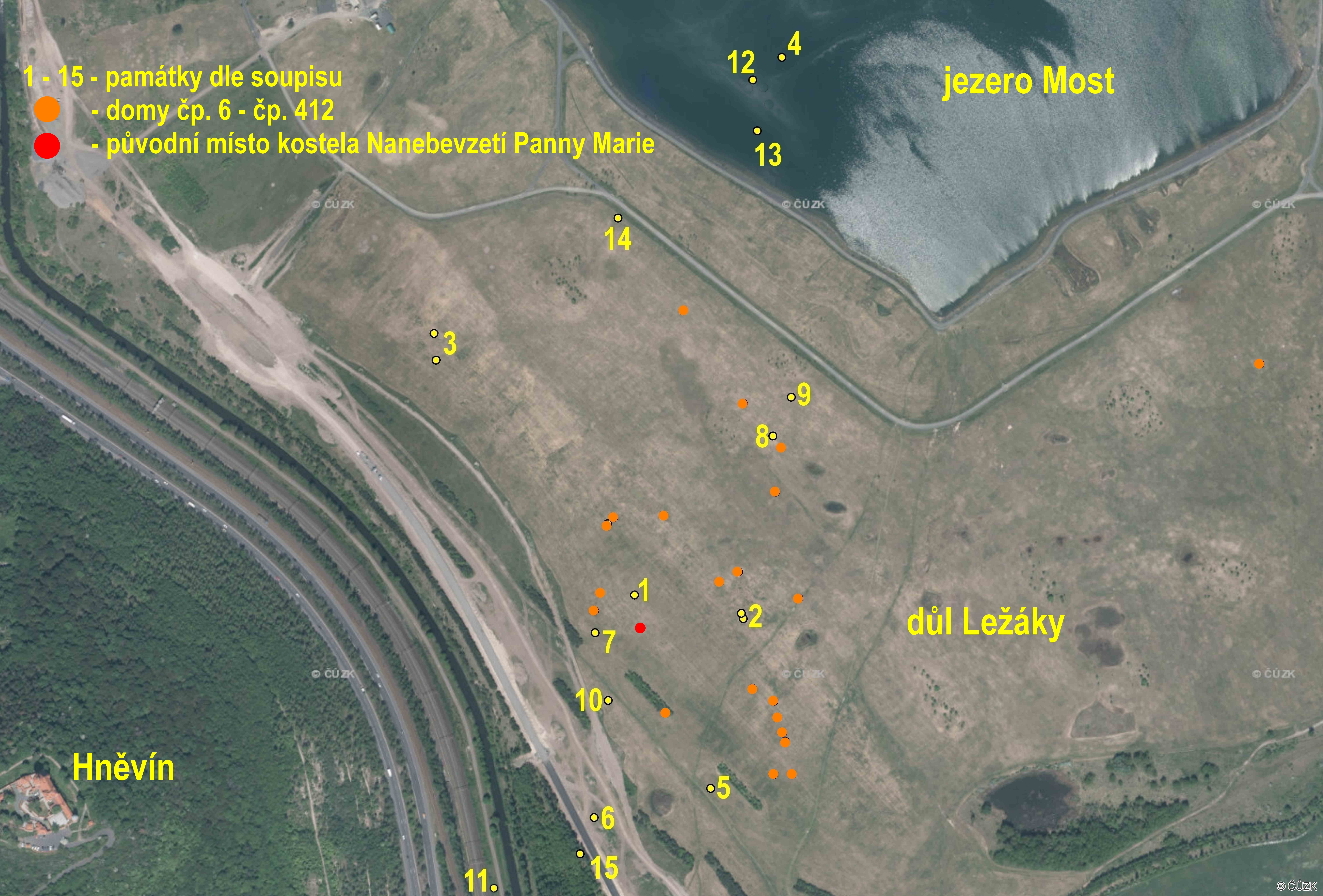 - Areál bývalého kláštera magdalenitek a dům č. p. 87 v Zahražanech - těžba nedostoupila do této oblasti, objekty byly v roce 1966 odstřeleny z důvodu výstavby nákupního a kulturního střediska (to již také neexistuje)