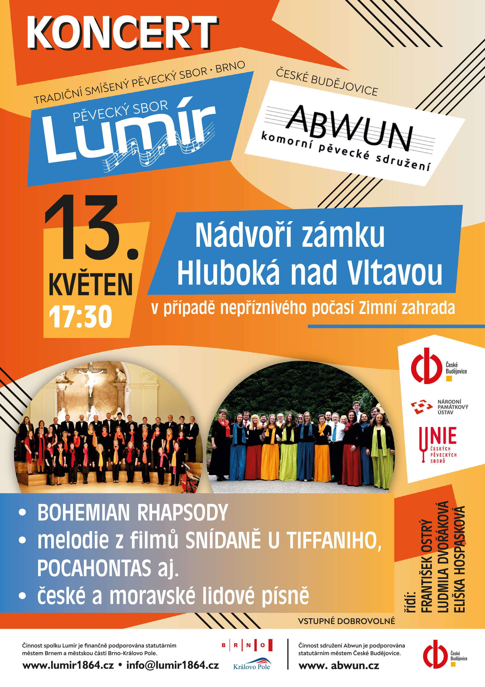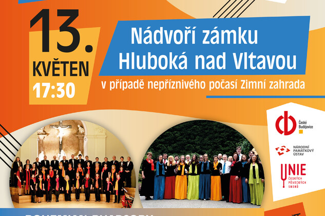 Nechte se unést do světa filmových melodií i lidových písní. Společný koncert pěveckého sboru Lumír z Brna a komorního pěveckého sdružení Abwun z Českých Budějovice se uskuteční na nádvoří zámku Hluboká v sobotu 13. května od 17:30.