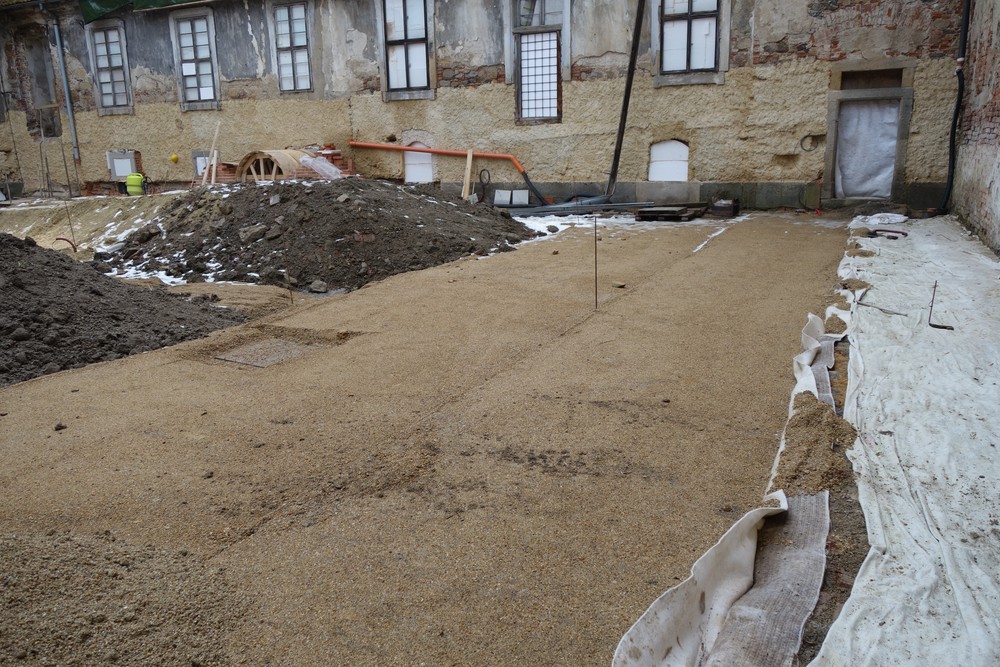 Rajský dvůr – provedeno podkladní lože z písku a jeho urovnání do figury pro následné dláždění okapových chodníků a ambitu u fasády kostela.