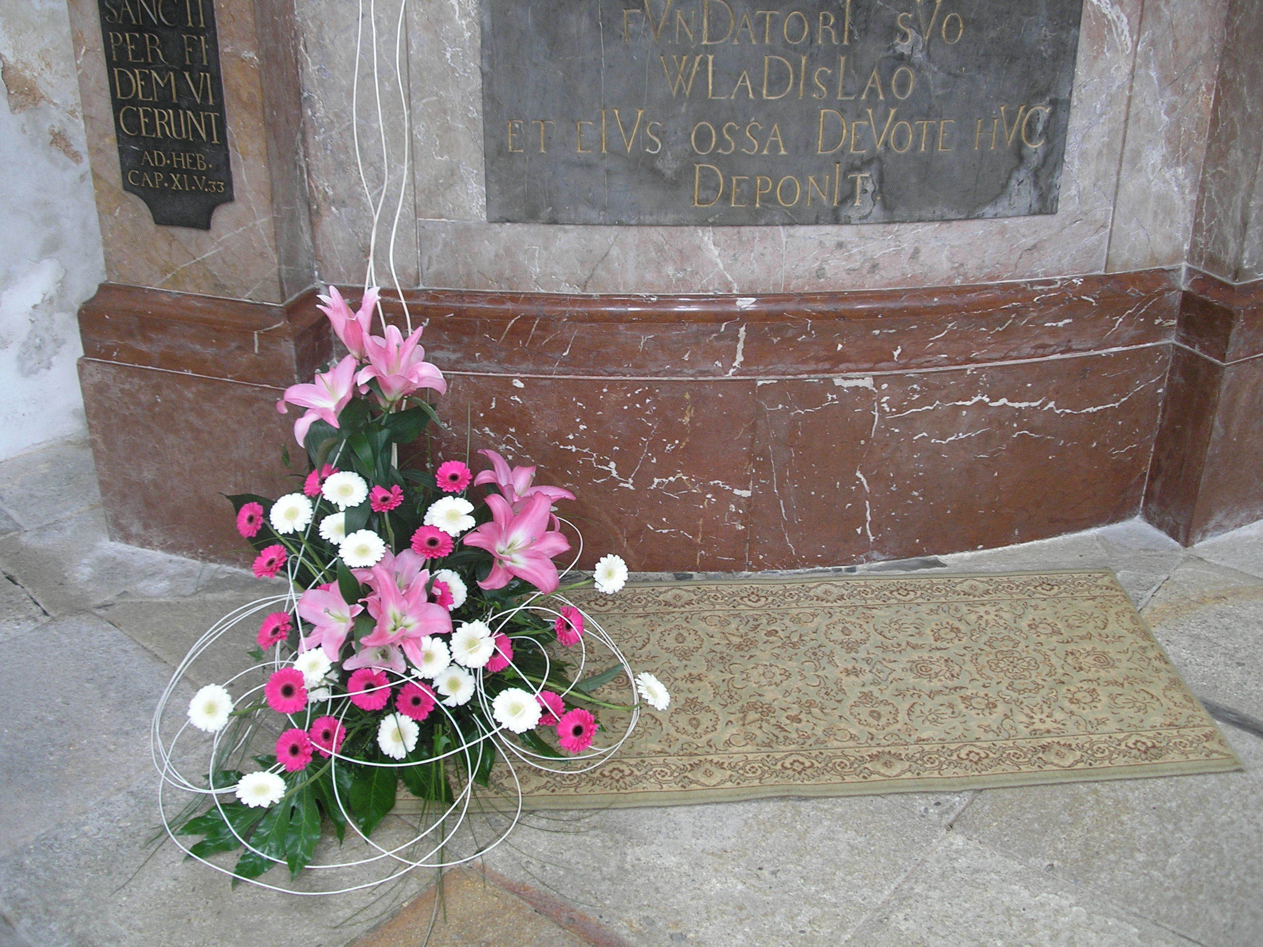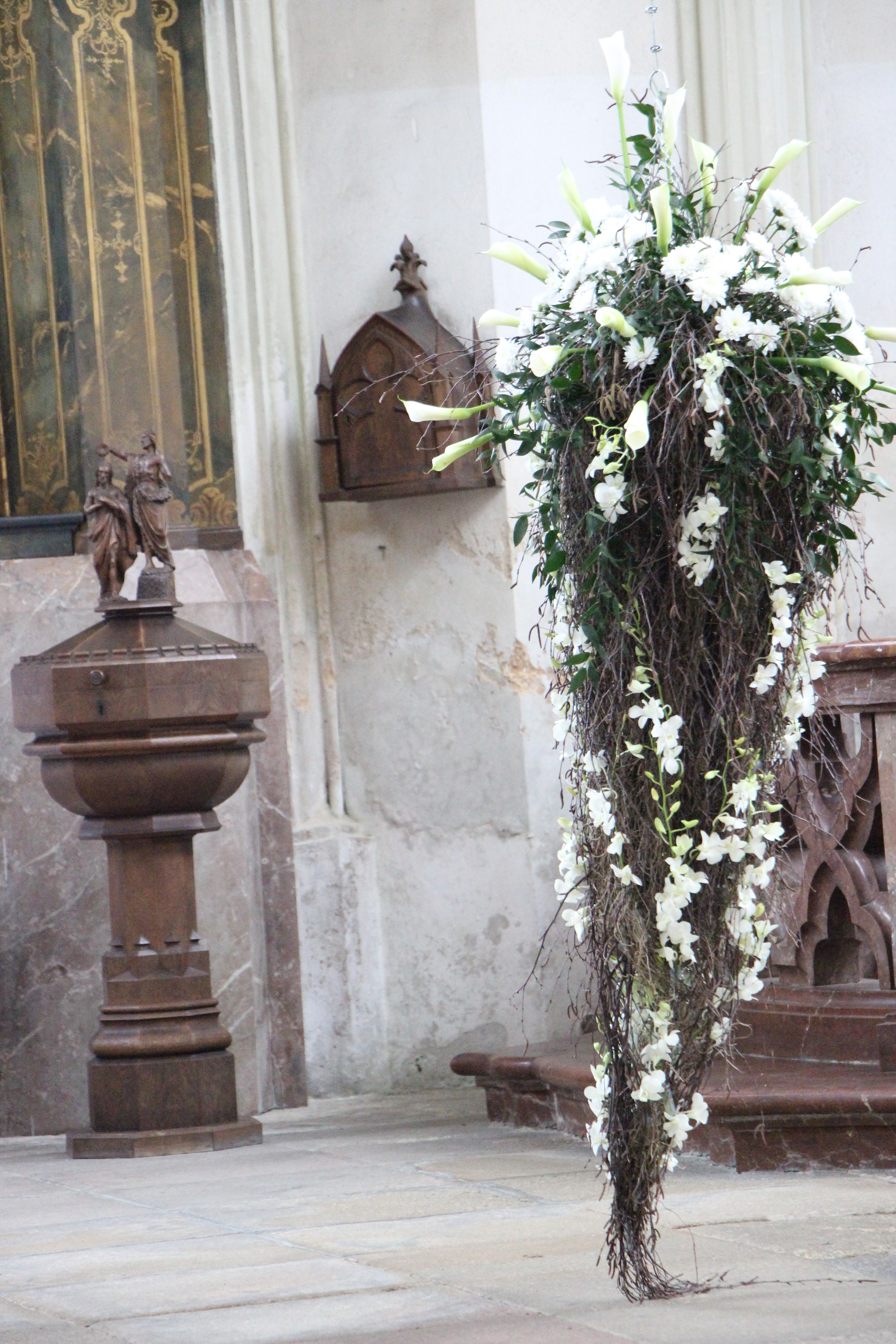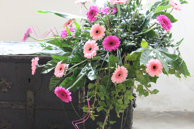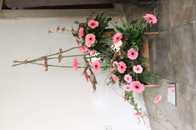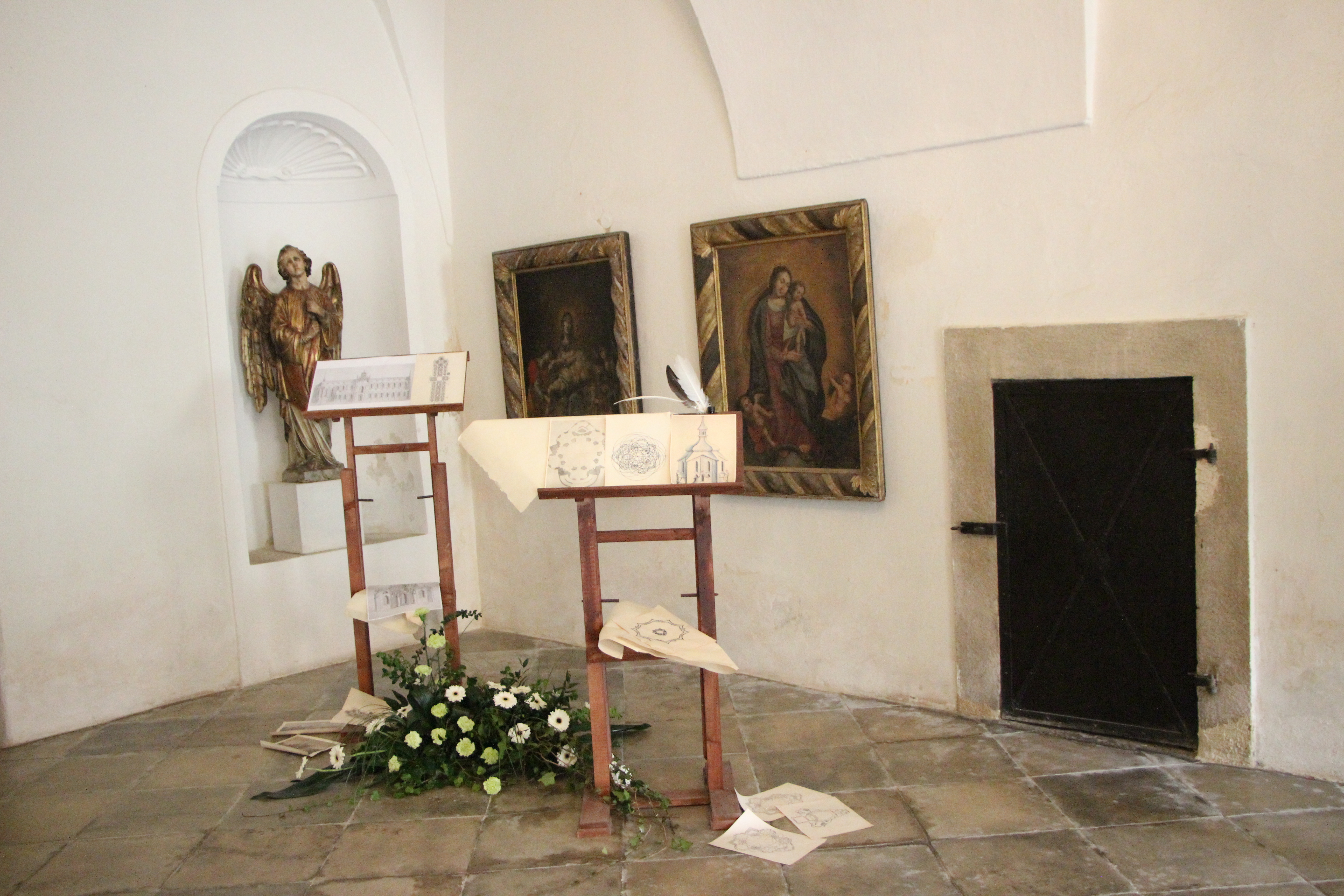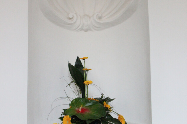 „Pracovaly jsme zejména s anturiemi, růžemi, orchidejemi a drobnokvětými chryzantémami Santini. Při tvorbě vazeb a aranží nás inspirovaly konkrétní Santiniho stavby. Například Kostnici v Sedlci u Kutné Hory a barokní kult smrti symbolicky připomíná aranž z proutí, suchých plodů a hlemýždích ulit“, prozrazuje jedna z autorek Petra Zelinková.