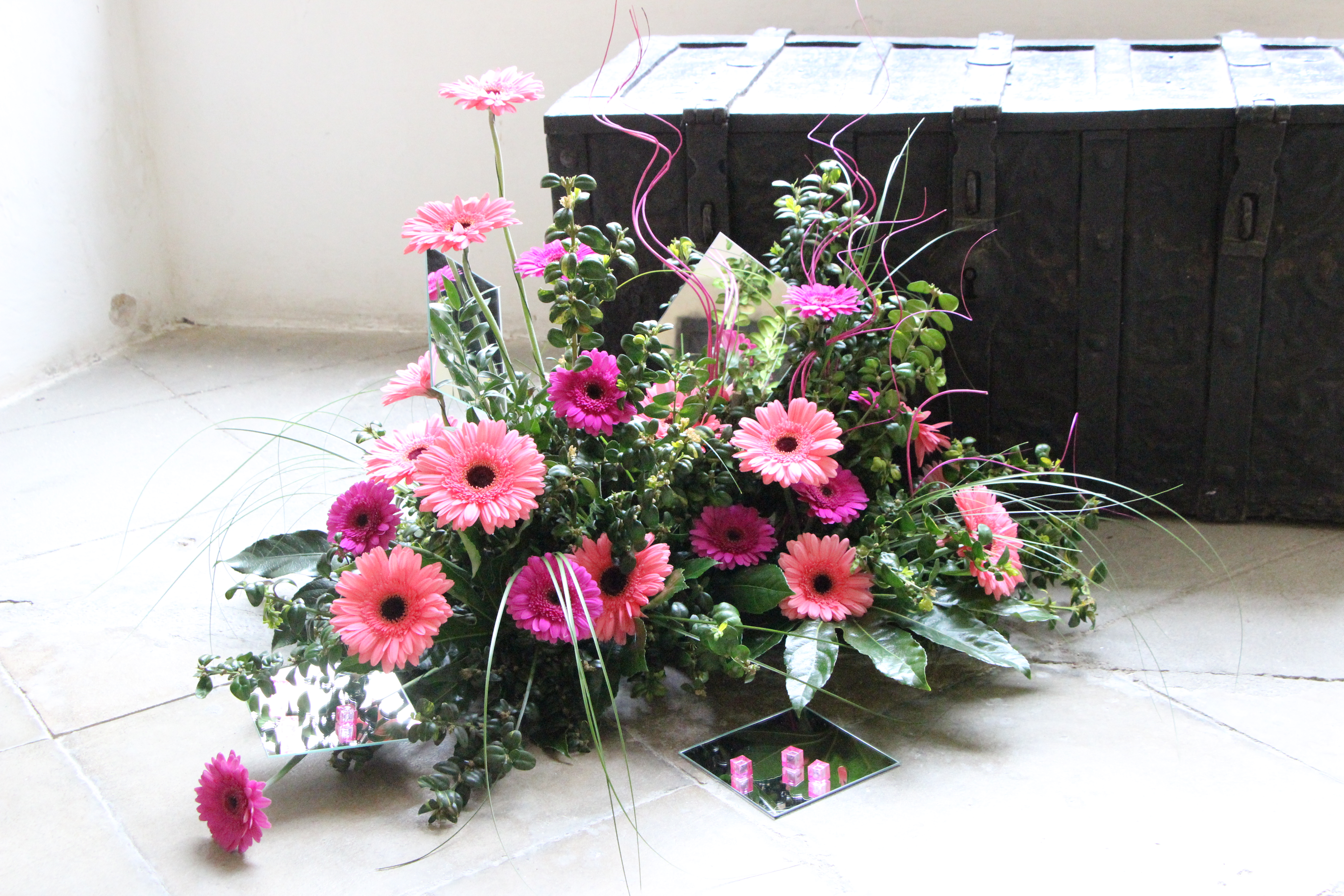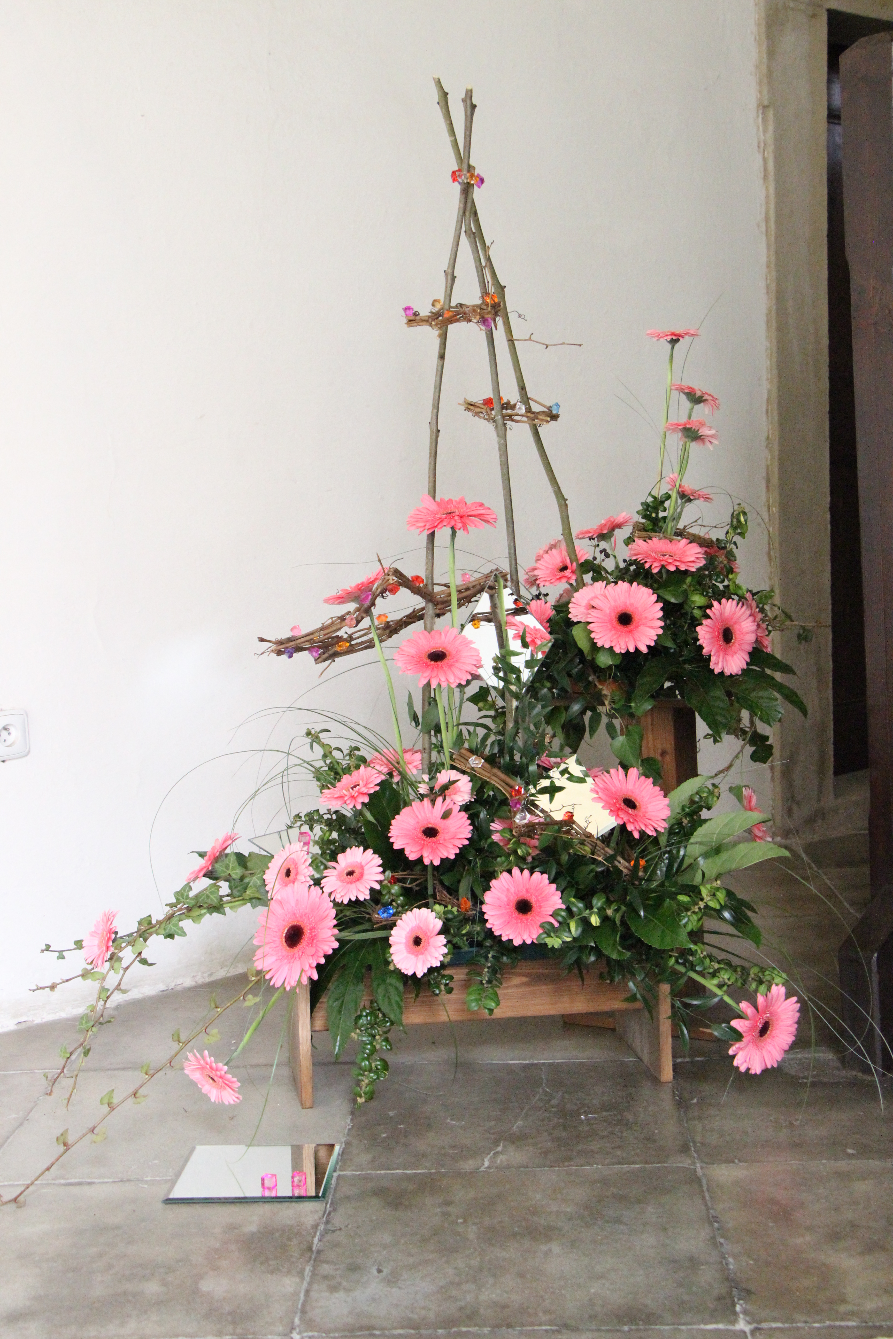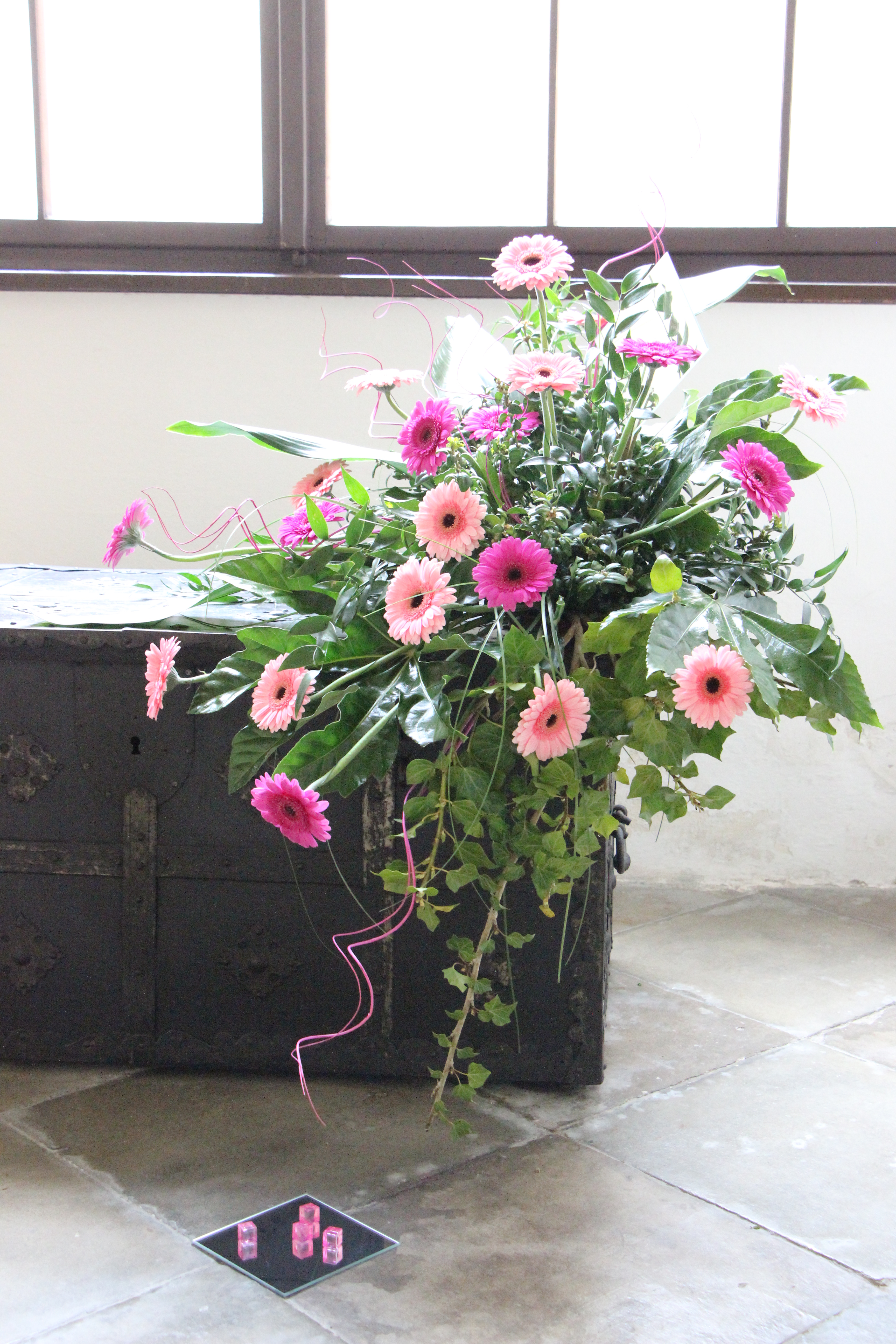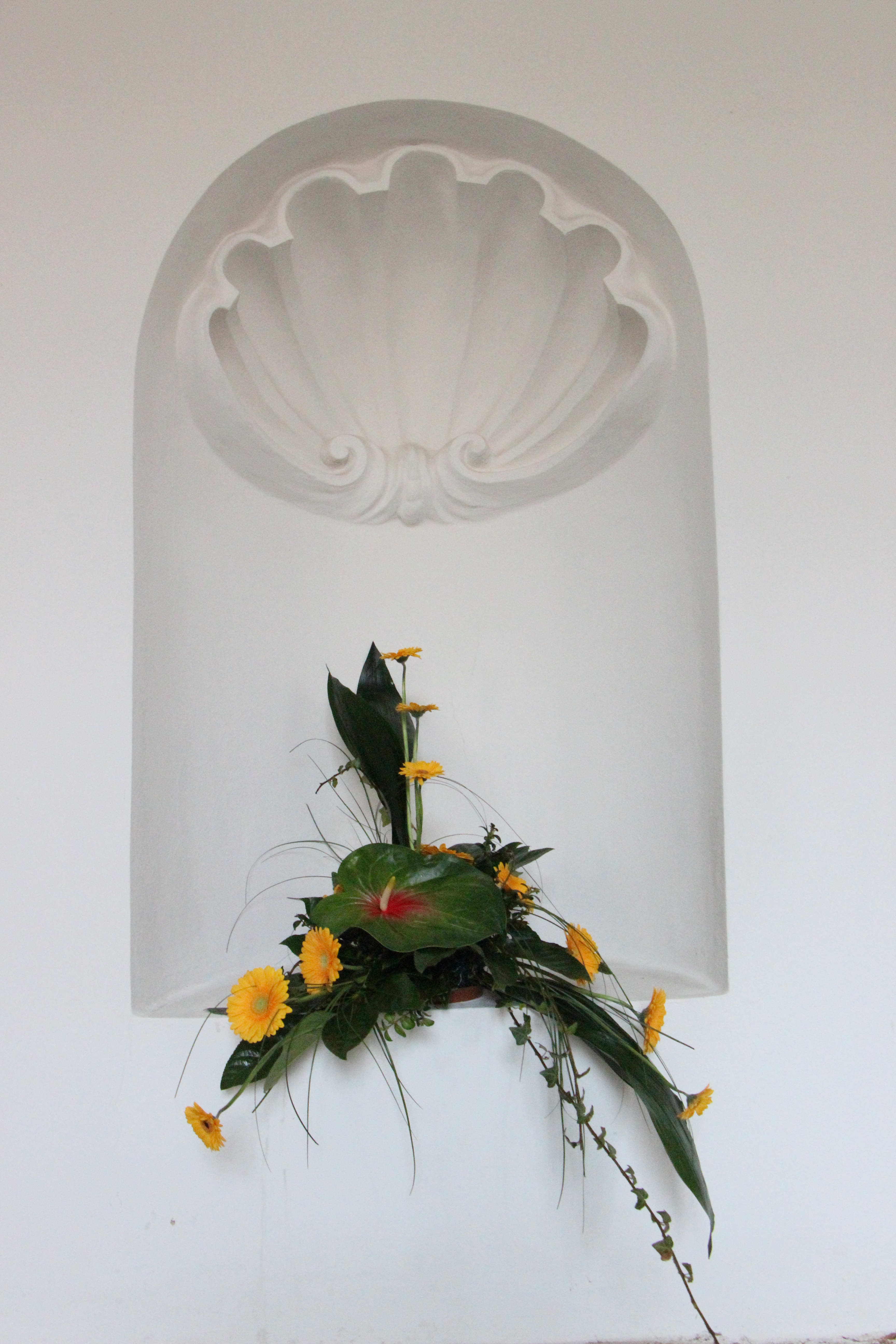 „Pracovaly jsme zejména s anturiemi, růžemi, orchidejemi a drobnokvětými chryzantémami Santini. Při tvorbě vazeb a aranží nás inspirovaly konkrétní Santiniho stavby. Například Kostnici v Sedlci u Kutné Hory a barokní kult smrti symbolicky připomíná aranž z proutí, suchých plodů a hlemýždích ulit“, prozrazuje jedna z autorek Petra Zelinková.