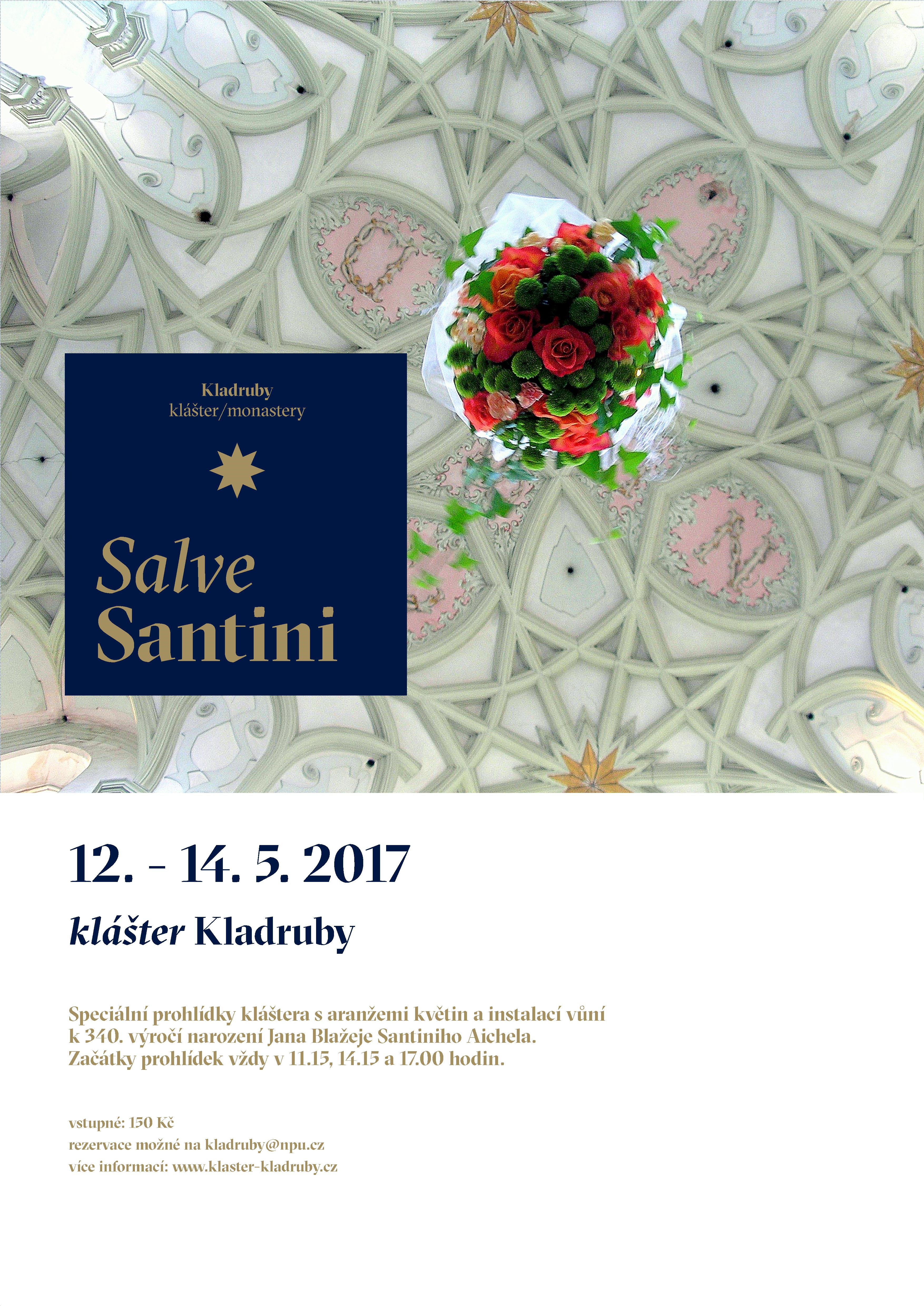 Ve dnech 12. – 14. května 2017 klášter Kladruby připomene speciálními prohlídkami nazvanými Salve Santini 340 let od narození Jana Blažeje Santiniho Aichela, autora barokní přestavby tamního kostela Nanebevzetí Panny Marie. Na návštěvníky v interiérech čekají originální květinové aranže, „ochutnávka“ vůní i prohlídka běžně nepřístupných prostor.