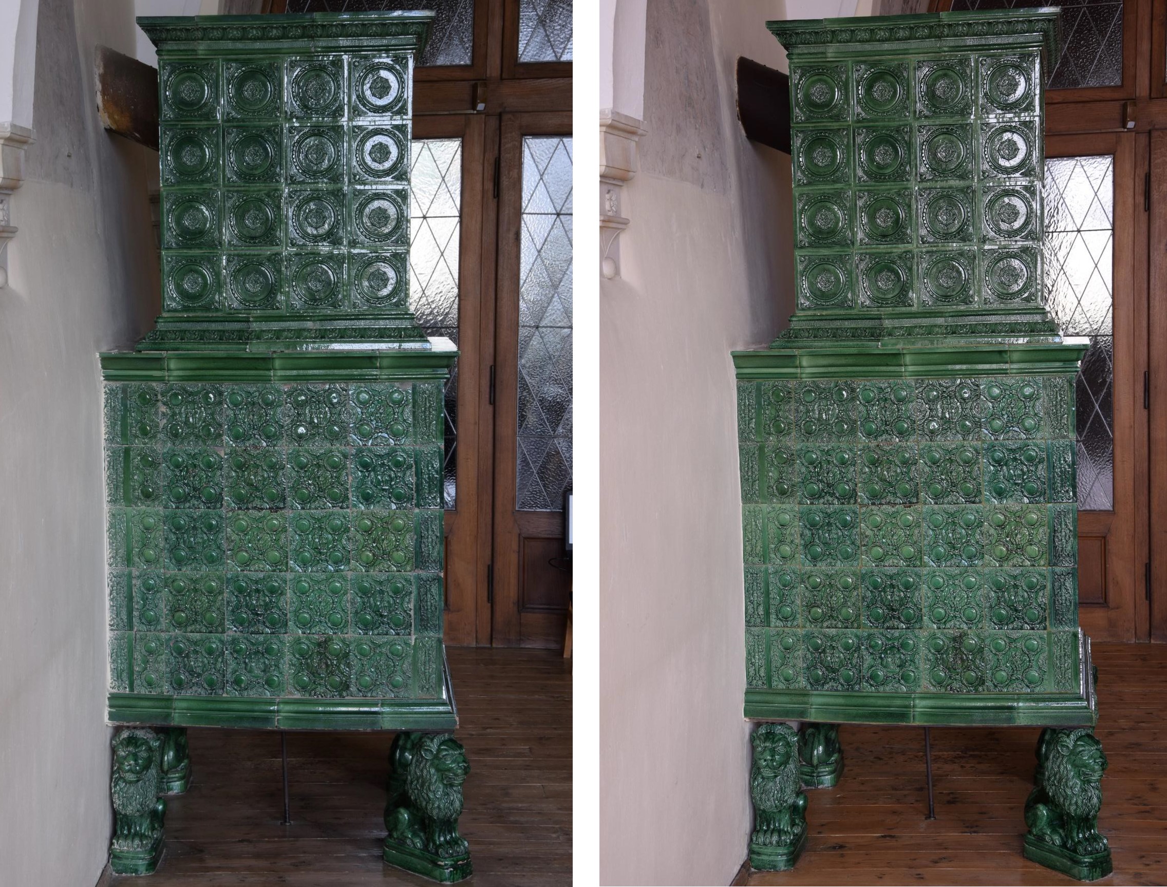 „Při restaurování nám přálo štěstí. U jednoho z kachlů, který byl velmi poškozen odpadáním glazury, chyběl i celý obličej lovce. Po dlouhém hledání a konzultacích s kolegy ve Švýcarsku se podařilo najít analogii pro tento konkrétní výjev a nakonec i původní dřevorytovou předlohu publikovanou poprvé v roce 1590. Chybějící část motivu tak bylo možné doplnit,“ připomněla jednu z nesložitějších částí restaurátorka Sylva Antony Čekalová.