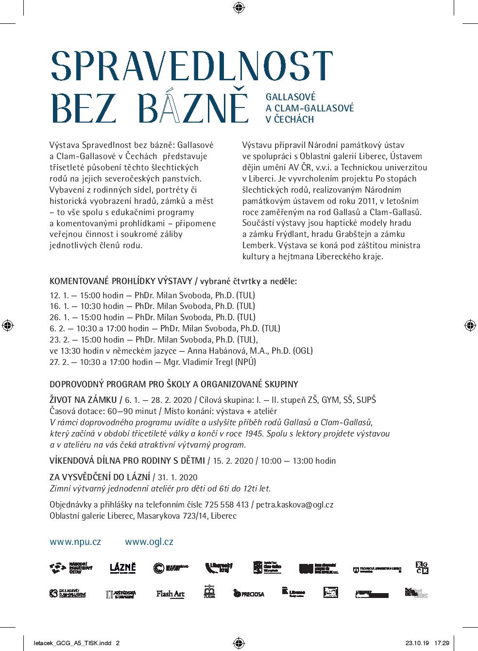 Výstava Spravedlnost bez bázně: Gallasové a Clam-Gallasové v Čechách představuje třísetleté působení těchto šlechtických rodů na jejich severočeských panstvích. Vybavení z rodinných sídel, portréty či historická vyobrazení hradů, zámků a měst – to vše spolu s edukačními programy a komentovanými prohlídkami – připomene veřejnou činnost i soukromé záliby jednotlivých členů rodu.
