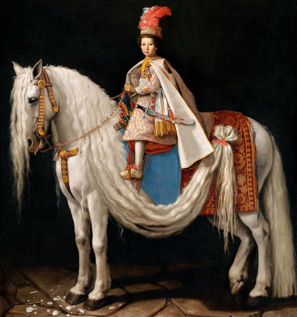 The horse's harness - as you rightly say - is very rich, and scholars in Florence have been trying to find out if any trace of it can be found in museum deposits. It is probable that the choice of harness was due to the wishes of the commissioner, Roberto Obizzi, who wanted to decorate this beautiful horse, whose main peculiarity is precisely that very long mane that makes him unique to our eyes. A horse so harnessed was perhaps meant to be used for parade ceremonies. Even the choice of portraying the young Leopold in Polish clothing must have served to make the painting more spectacular: the coat has been deliberately opened at the front to highlight the sabre whose scabbard is decorated with silver chiselling. The sabre, moreover, also appears in another portrait of Leopold, also by Sustermans, which is preserved in the Uffizi, where, however, the little prince is standing and of a younger age.